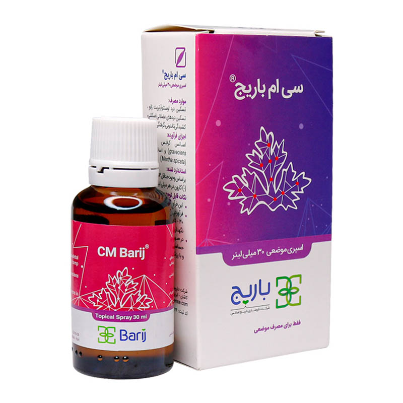 اسپری موضعی سی ام باریج اسانس حاوی اسانس نعنا و کرفس می باشد؛ اسانس کرفس دارای اثرات ضد التهاب، ضد اسپاسم و آرام بخش بوده و اسانس نعنا دارای اثرات ضد التهاب و آنتی اسپاسم است. این اسپری در تسکین دردهای عضلانی اسکلتی، تسکین درد اوستئوآرتریت زانو، کشیدگی تاندونی و رفع گرفتگی عضلانی موثر می باشد.