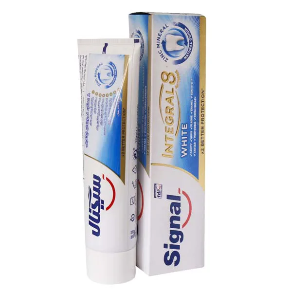 خمیر دندان اینتگرال ۸ سفید کننده سیگنال با ایجاد فسفات و کلسیم لازم برای مینای دندان، سبب پر شدن فرورفتگیها و حفرههایی که توسط پلاکهای میکروبی ایجاد شدهاند، میشود.