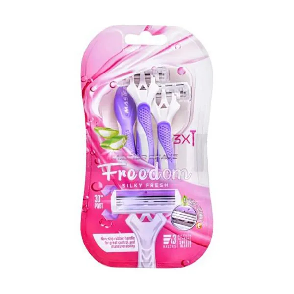 خوتراش 3 لبه مدل فریدوم دارای سری متحرک میباشد که هنگام شیو کردن (اصلاح) دسترسی را به نقاط و زوایای بدن که به راحتی اصلاح نمیشود را آسان کرده، بر روی لبه این محصول نوار روان کننده (صابونی) حاوی عصاره آلوئه ورا و ویتامین E میباشد که ضمن تسهیل در حرکت تیغ بر روی پوست از خشکی و ایجاد حساسیت پس از اصلاح جلوگیری میکند. تیغ های خود تراش مستر شیو از آلیاژ استیل مرغوب میباشد، و طراحی دسته محصول ارگونومیک بوده که هنگام استفاده کاملا با دست منطبق شده و از لیز خوردن خودتراش جلوگیری میکند. از مزیت های این محصول میتوان به جدا شدن سری آن اشاره کرد که بعد از اصلاح میتوان آن را جدا کرده و به راحتی شستشو داده واز موهای زائد آن را پاک کرد.