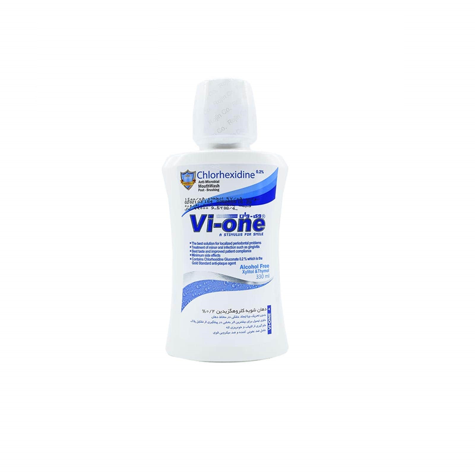 در ترکیبات این دهانشویه، کلروهگزیدین وجود دارد. کلرهگزیدین یک ماده ضد میکروبی قوی است که باکتریهای دهان و پلاک دندان را کاهش میدهد. این محصول در درمان عفونتهای دهانی و زخمهای ناشی از التهاب لثه استفاده میشود. دهانشویه کلرهگزیدین وی وان فاقد الکل است. لازم به ذکر است در فرمولاسیون این محصول از زایلیتول استفاده شده است که علاوهبر مطلوب ساختن طعم دهانشویه، سبب افزایش ترشح بزاق، کاهش ترشح اسید توسط باکتریها و افزایش رمینراله شدن مینای دندان میشود.