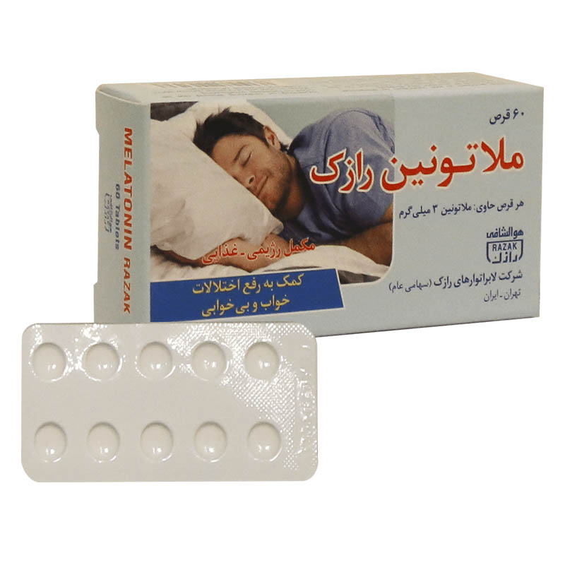 قرص ملاتونین 3 میلی گرم رازک محصول شرکت لابراتورهای رازک (سهامی عام) به منظور کمک به بهبود خواب در بسته بندی های 60 عددی عرضه میشود.
