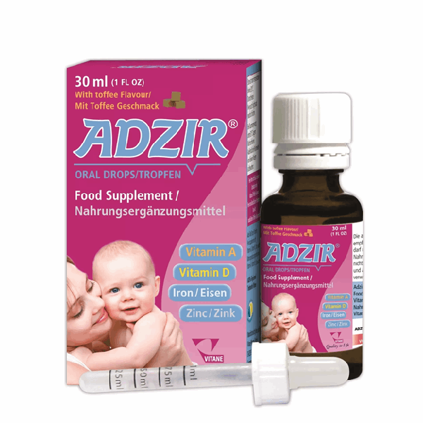 قطره آدزیر، یک مکمل تغذیهای با کیفیت است که به رشد مناسب فیزیکی و ذهنی نوزاد کمک میکند. ترکیبات قطره آدزیر، شامل ویتامین A، ویتامین D، آهن و زینک است. آدزیر، میتواند در پیشگیری از کم خونی فقر آهن، سلامت استخوان و تنظیم اشتها در نوزادان کمک کننده باشد. قطره ادزیر، تحت لیسانس کشور آلمان بوده و توسط شرکت ویتان فارما در ایران تولید میشود. این مکمل در بطری 30 میلی لیتری به همراه قطره چکان به بازار عرضه میشود. adzir با طعم دلپذیر کارامل تافی موجود است و برای استفاده کودکان بالای 6 ماه، مناسب میباشد.