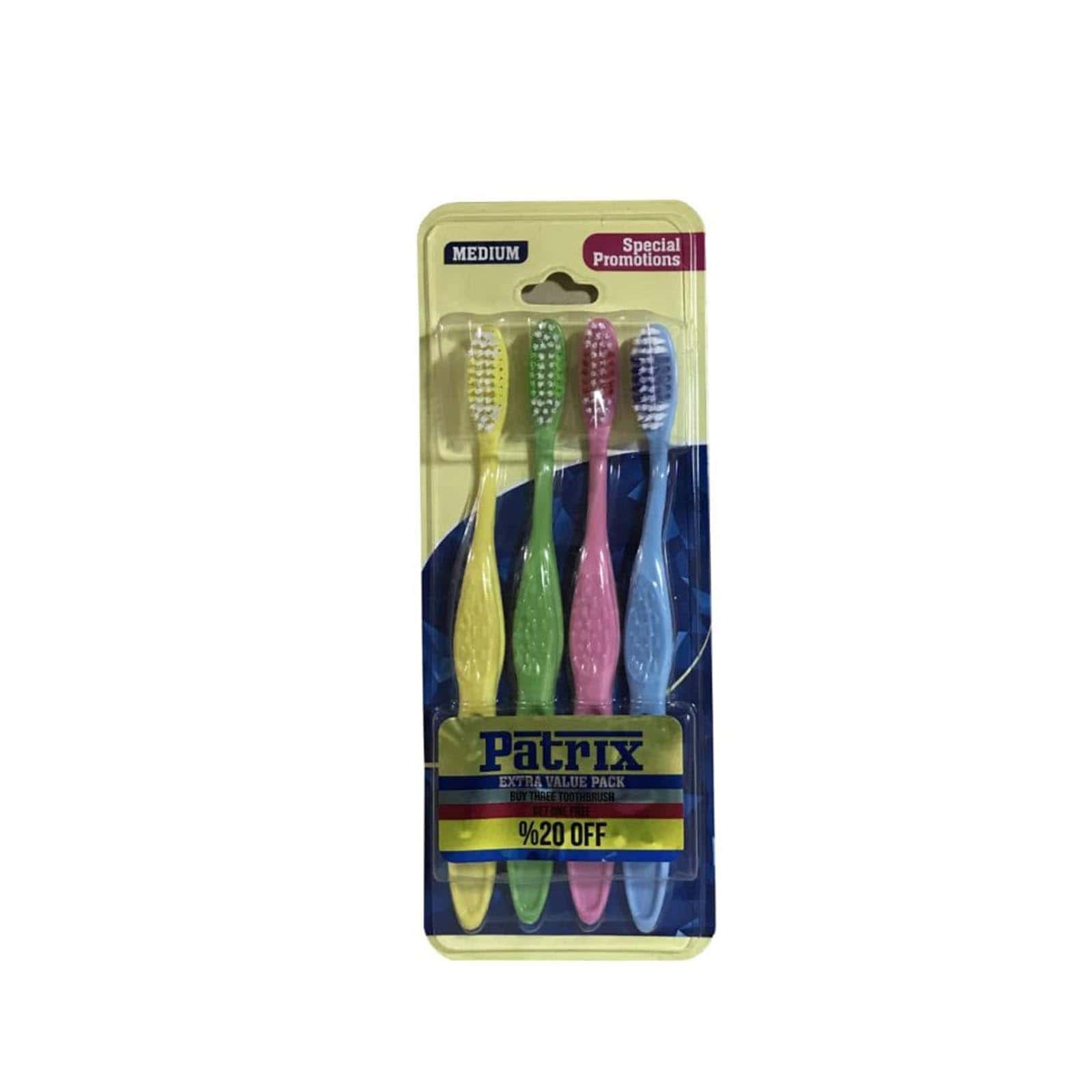 مسواک چهار قلوی پاتریکس مناسب برای بزرگسالان و با درجه سختی متوسط است. این محصول از دسته و پایه برس از جنس پلی استایرن با گرید خوراکی و برس فیلامنت از جنس پلی آمید با گرید خوراکی می باشد.