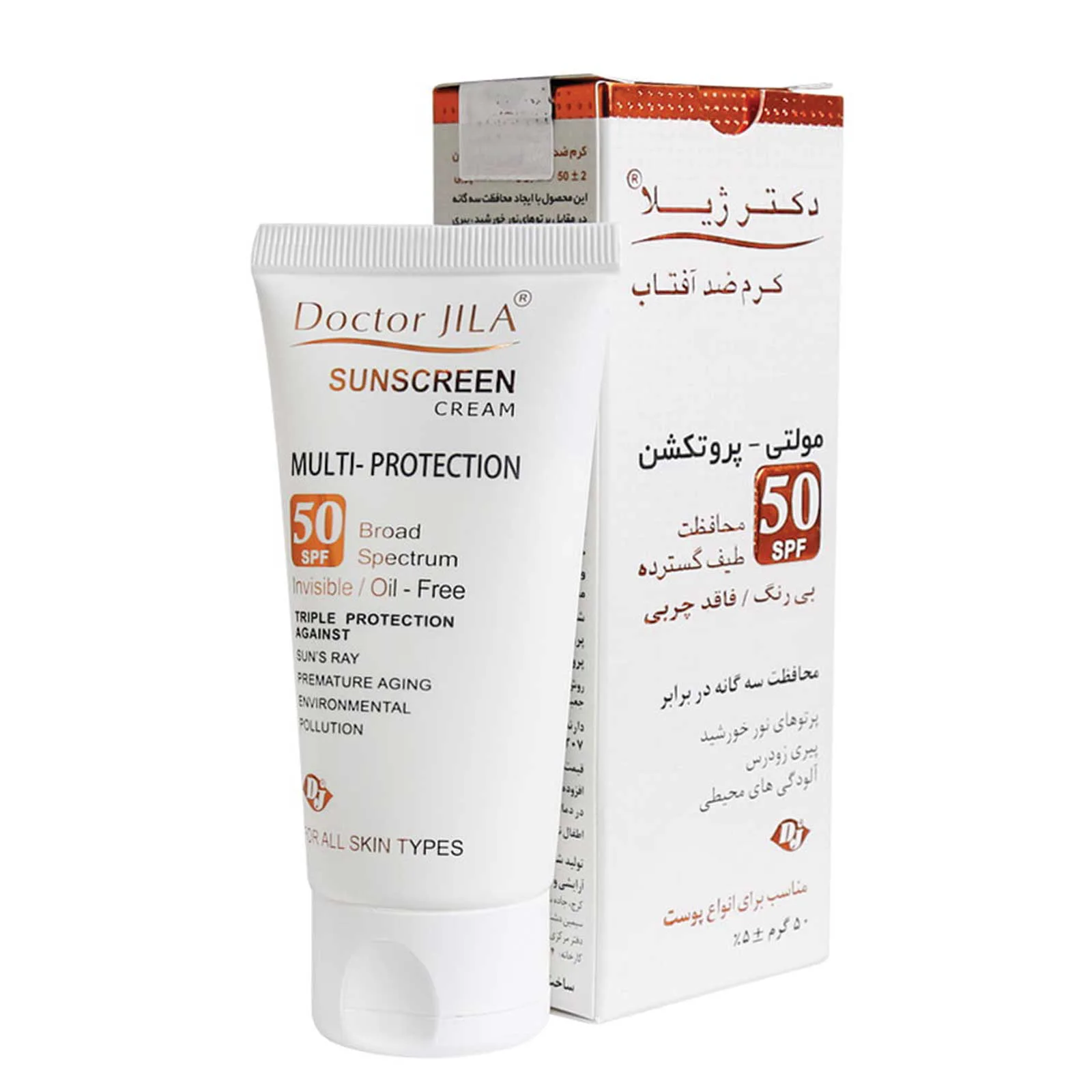 کرم ضد آفتاب مولتی پروتکشن دکتر ژیلا SPF۵۰ با ایجاد محافظت سهگانه در مقابل پرتوهای نور خورشید، پیری زودرس پوست و همچنین آلودگیهای محیطی، نقش مهمی در حفظ جوانی و شادابی پوست ایفا میکند. این کرم علاوه بر جاذبهای فیزیکی و شیمیایی گوناگون، حاوی ترکیباتی است که از طریق تاثیر بر روی مسیرهای داخل سلولی، از اثرات مخرب پرتوهای فرا بنفش و آلودگیهای محیطی بر روی سلولهای پوست جلوگیری میکند. این محصول به علت دارا بودن مجموعهای از آنتی اکسیدانهای قوی، دارای خواص ضد چروک نیز است. نوع بی رنگ این کرم برای استفاده آقایان نیز مناسب است.