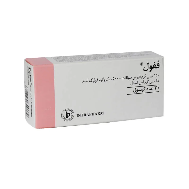قرص فیفول اینترافارم برای پیشگیری و یا درمان کم خونی فقرآهن و یا کمبود فولیک اسید مورد استفاده قرار میگیرد. قرص اهن ففول یا فیفول با جعبه و بسته بندی سفید و نوار صورتی رنگ تولید شده شرکت اینترافارم انگلستان است که به همین جهت به آن fefol انگلسی نیز میگویند. پوسته کپسولها از دو قسمت شفاف و سبز تشکیل شده است که حاوی گرانولهایی به رنگ قرمز، زرد کم رنگ و سفید است. کپسول ففول اینترافارم به صورت اسپانسیول فرموله شده است. اسپانسول به مفهوم آزاد سازی تدریجی یا SR Sustained Released بوده که به تدریج و در طی چند ساعت در دستگاه گوارش آزاد میشود، به گونهای که بیشترین آهن موجود در آن در بخش فوقانی روده کوچک (جایی که بیشترین جذب در آنجا صورت میپذیرد) به تدریج آزاد میشود.